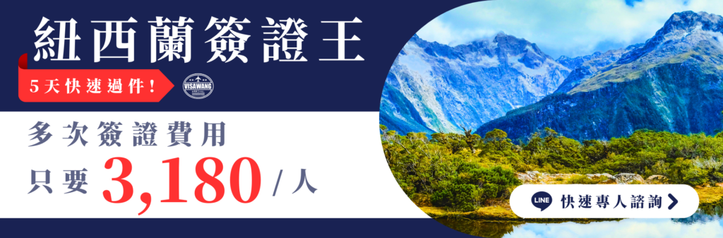 紐西蘭簽證費用會依據簽證種類而有不同,例如紐西蘭電子旅行授權NZeTA的費用是1700元。如果您需要申請其他種類的簽證,如過境簽證或商務簽證,您可以加入紐西蘭簽證王Line官方帳號,直接與專人詢問詳細的費用資訊。
