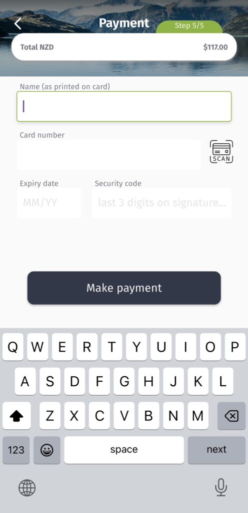 App 版費用合計為 NZD $117(旅遊/商務),支援 Visa/Mastercard/American Express 等信用卡。